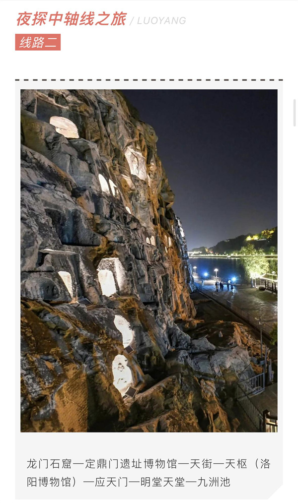 北起邙山、南至伊闕,隋唐洛陽城中軸線,是一條串起歷史與文化的線路。皓月當空,燈光亮起,臨水觀月、游園賞月、登高望月……夜色伴著月色,何其浪漫。