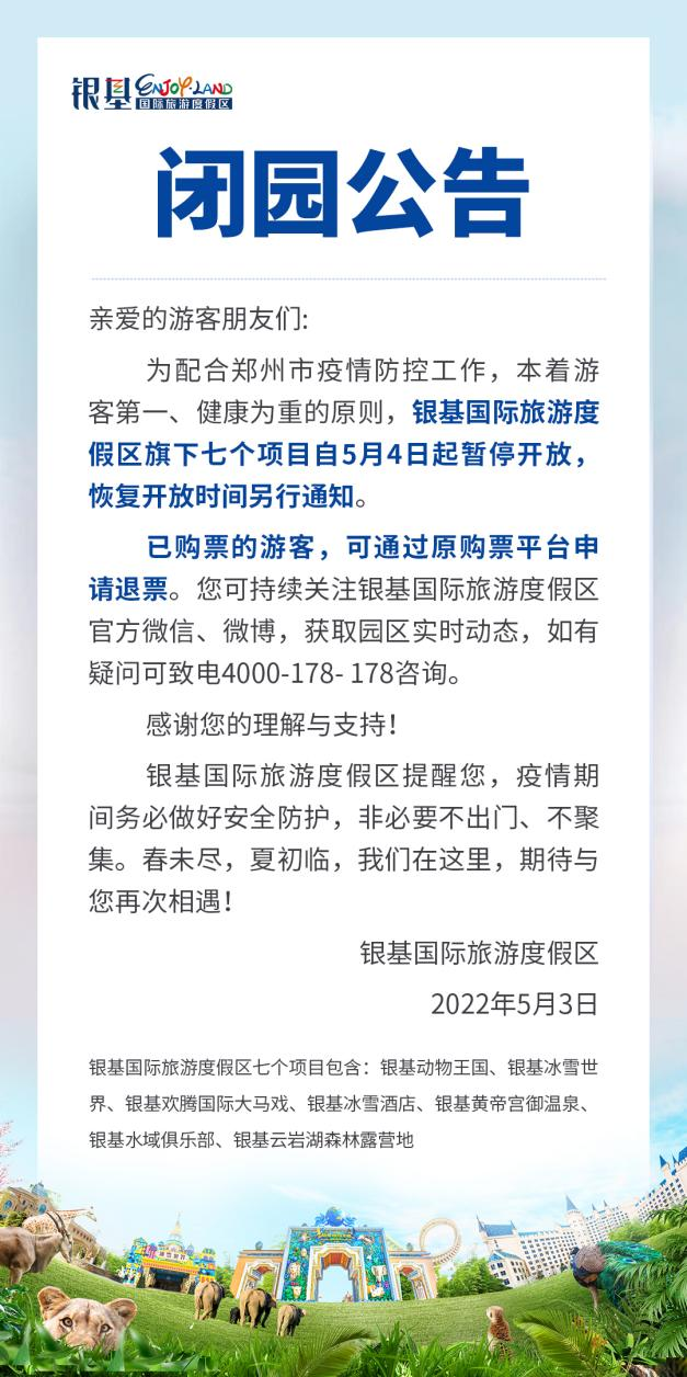 通告發(fā)布后,河南一文旅景區(qū)——銀基國際旅游度假區(qū),于當(dāng)日傍晚發(fā)布公告稱,本著游客第一、健康為重的原則,為了減少人員流動,該度假區(qū)旗下七個項目將于5月4日起暫停開放,恢復(fù)開放時間另行通知。