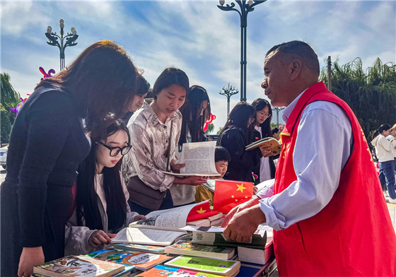 睢縣圖書館工作人員為游客介紹記錄睢縣地域文化的書籍 徐澤源 攝