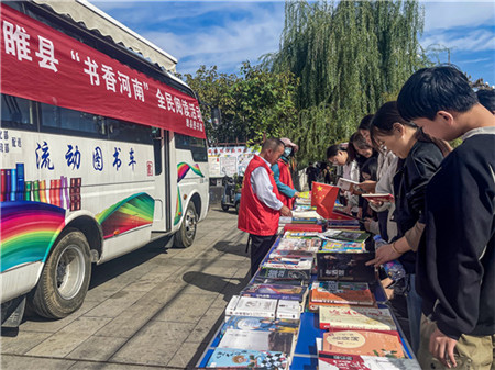 睢縣圖書館流動圖書車送書到景區(qū),游客在流動圖書車前挑選心儀的圖書。 徐澤源 攝