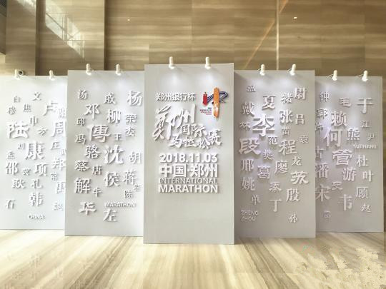 圍繞河南的根親文化,以“跑步去尋根”為主題,本屆鄭州國際馬拉松組建了由120位不同姓氏代表組成的“姓氏跑團”,“姓氏跑團”們高舉姓氏圖騰大旗參加半程馬拉松賽;在賽道重點區(qū)域?qū)[放56面印有姓氏圖騰的大鼓,象征著56個民族是一家,并設(shè)置姓氏文化墻,介紹姓氏起源、變遷以及行駛中的歷史名人,讓選手們通過姓氏了解自己、認知鄭州。