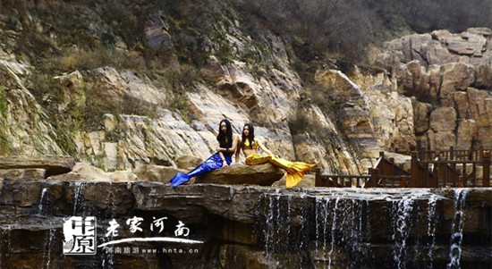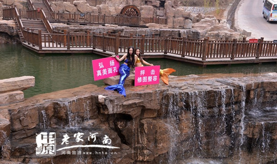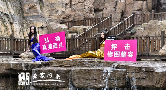 今天,在洛陽黛眉山景區(qū),兩條“美人魚”裝扮的美女在水溪旁,高舉“要真情不要假意征誠信男友渣男走開”、“弘揚(yáng)真美面容,抨擊修圖整容”字樣的牌子引發(fā)游客關(guān)注。