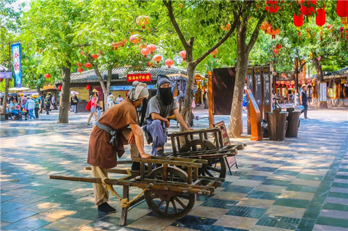 與演員互動,和小乞丐一起在城門下消夏乘涼。