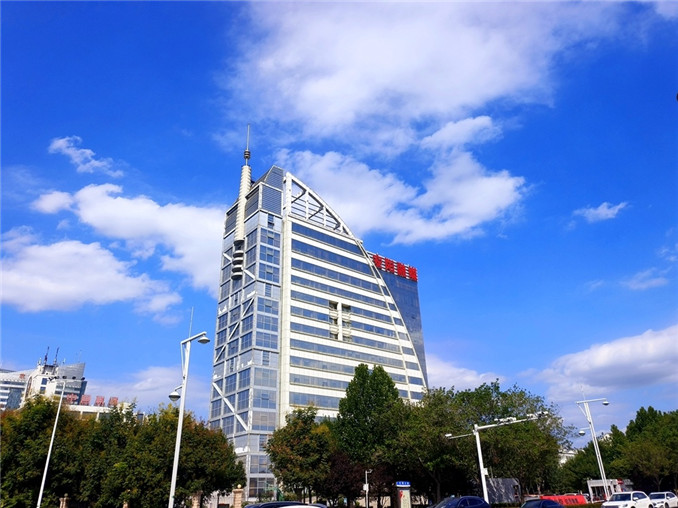 圖為藍(lán)天白云映襯下的安陽市融媒體中心辦公樓。 吳瑞英 攝