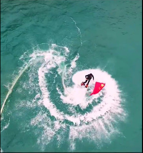 水上飛人高舉五星紅旗向游客問好致意