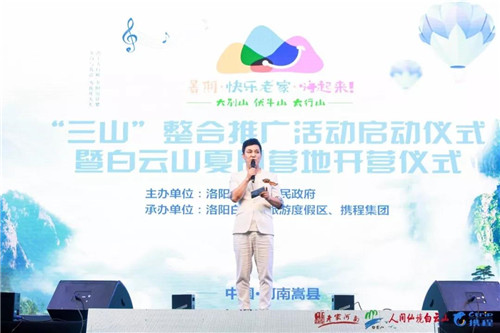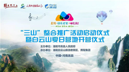 2019年7月29日,“三山”整合推廣活動(dòng)啟動(dòng)儀式暨白云山夏日營(yíng)地開(kāi)營(yíng)儀式在洛陽(yáng)白云山旅游度假區(qū)盛大開(kāi)營(yíng),此次活動(dòng)是由洛陽(yáng)市嵩縣人民政府主辦,洛陽(yáng)市白云山旅游度假區(qū)和攜程集團(tuán)承辦。河南省文化和旅游廳黨組成員、省紀(jì)委監(jiān)委駐省文化和旅游廳紀(jì)檢監(jiān)察組組長(zhǎng)李,F(xiàn),洛陽(yáng)市文化廣電和旅游局黨組成員、調(diào)研員路毅,嵩縣人民政府副縣長(zhǎng)趙靈偉,攜程集團(tuán)政府資源合作副總經(jīng)理、目的地營(yíng)銷(xiāo)總經(jīng)理張旭,洛陽(yáng)白云山文化旅游發(fā)展有限責(zé)任公司副總經(jīng)理寇曉華等出席了當(dāng)晚的開(kāi)營(yíng)儀式。