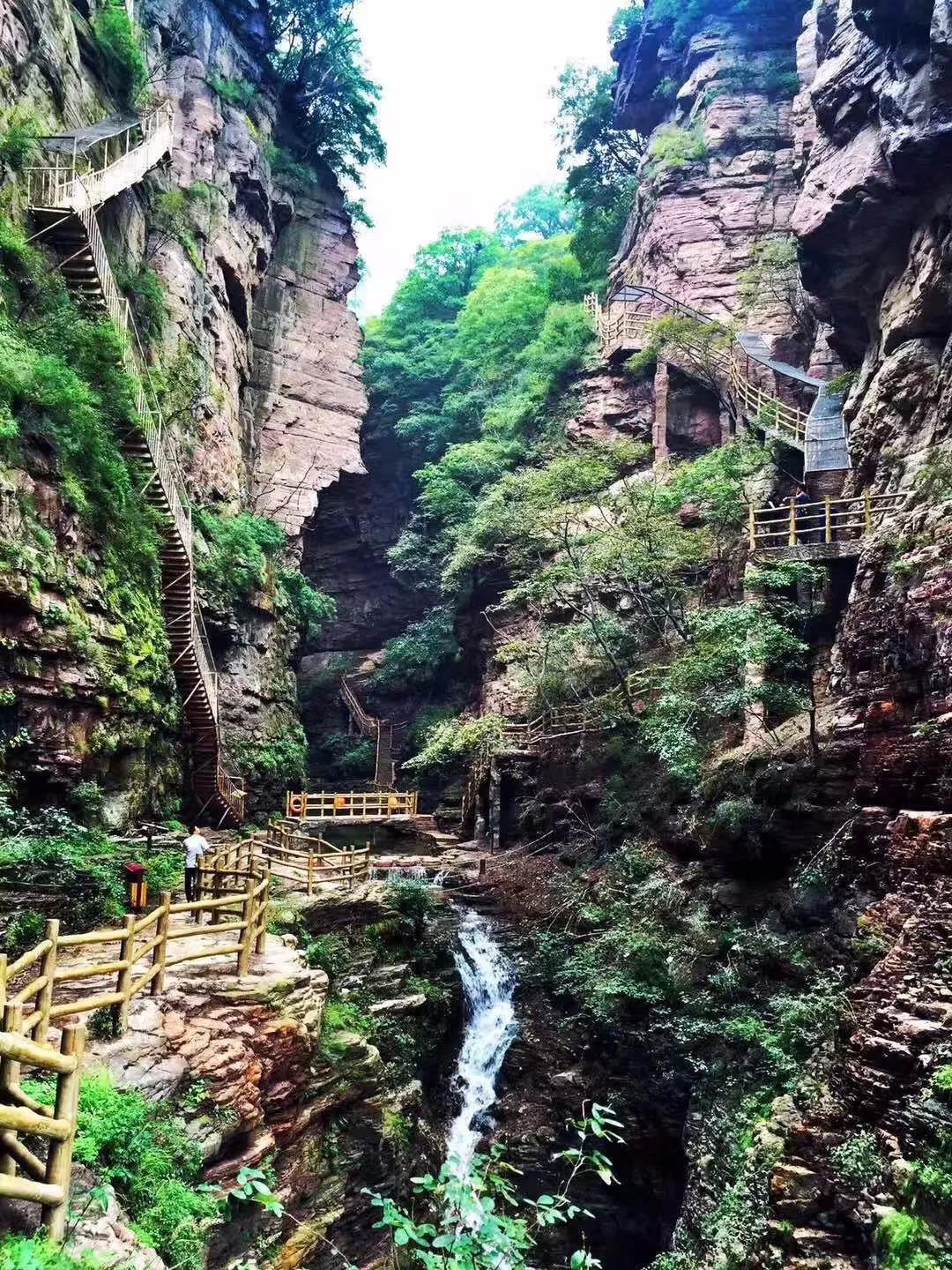 兩側(cè)高山聳立、紅巖對峙、峭拔宏偉,峽內(nèi)水流湍急,林木青翠。沿壁根石階而下,綠蔭掩映間,一條碧水穿峽而過,潺潺作響,徜徉于雙崖壁立的峽間。