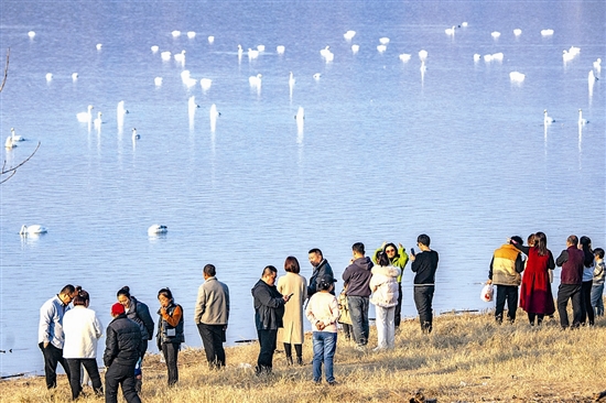 日前,三門峽市城鄉(xiāng)一體化示范區(qū)(高新區(qū))黃河濕地迎來了一大批白天鵝,吸引周邊游客紛紛前往觀賞。