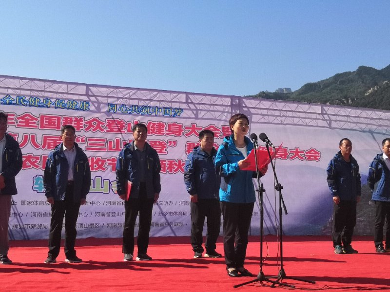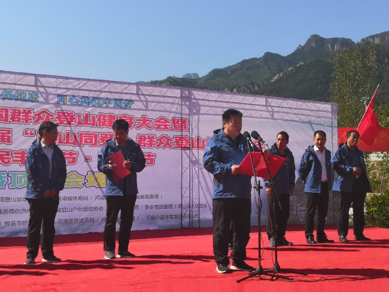 2018年9月23日,2018年全國群眾登山健身大會暨“體彩杯”河南省第八屆“三山同登”群眾登山健身大會和首屆農民豐收節(jié)·曬秋節(jié)在轎頂山景區(qū)隆重開幕。河南省體育局社體中心副主任李罡、新鄉(xiāng)市外事僑務旅游局局長崔紅、新鄉(xiāng)市體育局副局長王建華、輝縣市委常委宣傳部部長靳開偉、輝縣市文明辦主任路會民、輝縣市體育發(fā)展中心主任張曉銀、輝縣市旅游發(fā)展中心主任劉振、沙窯鄉(xiāng)黨委書記劉俊輝、河南省登山協(xié)會副秘書長、河南戶外聯(lián)盟理事長陳學政、輝縣市轎頂山景區(qū)董事長趙平生等領導出席此次活動。來自全國各地的眾多登山愛好者、媒體朋友和攝影愛好者在此聚集,在這個五彩斑斕的季節(jié)暢游最美轎頂山。