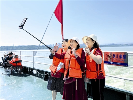 來自陜西渭南的三姐妹在“天鵝號”游輪上與黃河合影留念 崔盼盼 攝