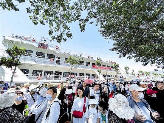 頂層甲板上游客爭相拍照、熱鬧非凡,一樓船艙里精彩的非遺展演和文藝節(jié)目也在激情開演……