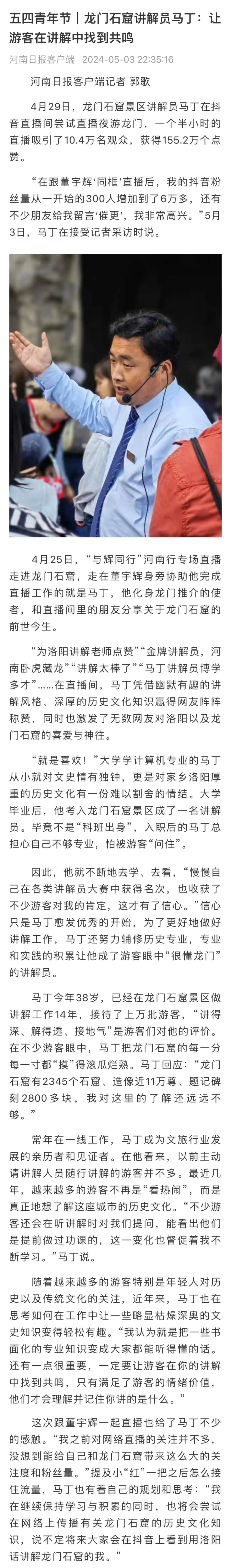 【河南日?qǐng)?bào)】五四青年節(jié)專訪龍門石窟講解員馬丁