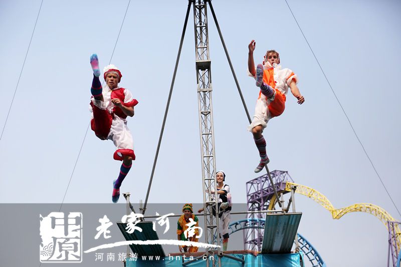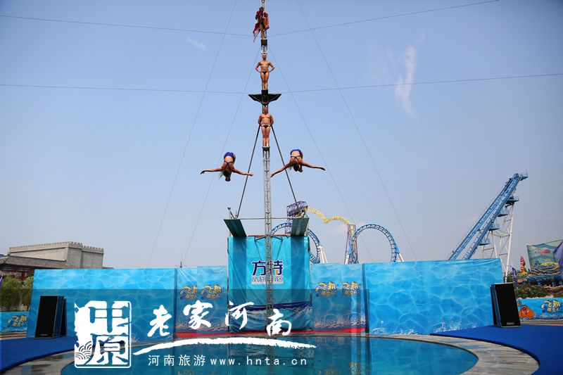 此節(jié)目名為“飛翔的荷蘭人”,是鄭州方特歡樂世界海盜狂歡節(jié)推出的重量級活動。在30米特制高空跳臺上,來自荷蘭的跳水隊員,一會兒單人跳、一會兒雙人跳、五人跳,做出前滾翻、后滾翻等各種動作,還有穿上小丑邊跳繩邊跳水花樣表演,眾多游客一飽眼福、嘆為觀止。