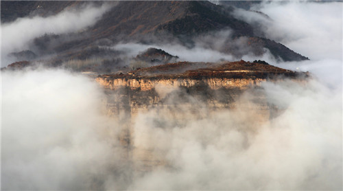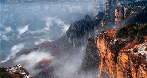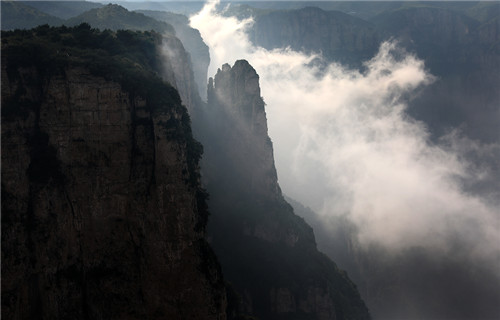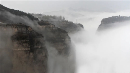 云霧在山峰間翻涌著,山峰在云海之中若隱若現(xiàn)奇妙、壯觀、渾然一體,太行大峽谷如幻景一般被層層云霧包裹著美得如夢(mèng)似幻……