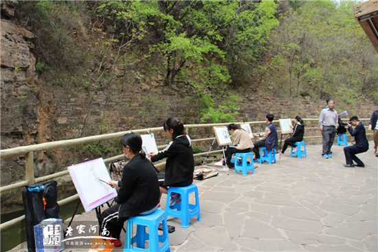 研學游場景展示現(xiàn)場, 1000名學生布滿紅旗渠渠岸,進行書法、繪畫、攝影、拓印等專業(yè)姿態(tài)展示。