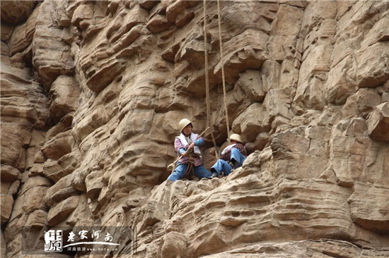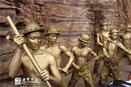 凌空除險再現(xiàn)在一個表演區(qū)內(nèi)安排30人再現(xiàn)修渠女民工造型:測量、打鋼釬(鳳凰雙展翅)、推車,凌空除險等,再現(xiàn)當年紅旗渠建造場景。