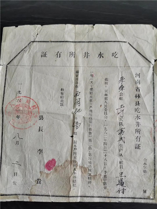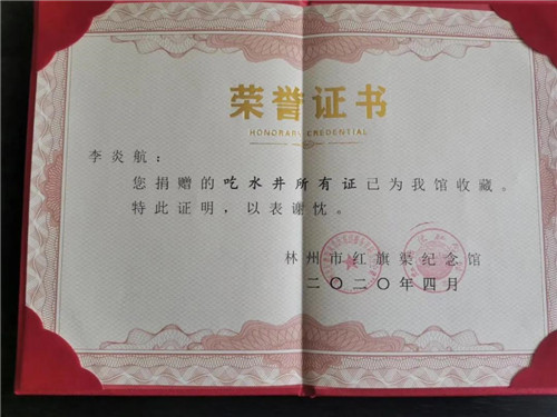 近日,紅旗渠風景區(qū)接受林州愛心人士李炎航捐贈的《吃水井所有證》,在紅旗渠通水55周年之際,此次愛心捐贈更是意義非凡。紅旗渠風景區(qū)向捐贈者頒發(fā)榮譽證書,以表謝忱。目前,《吃水井所有證》已被紅旗渠紀念館收藏。