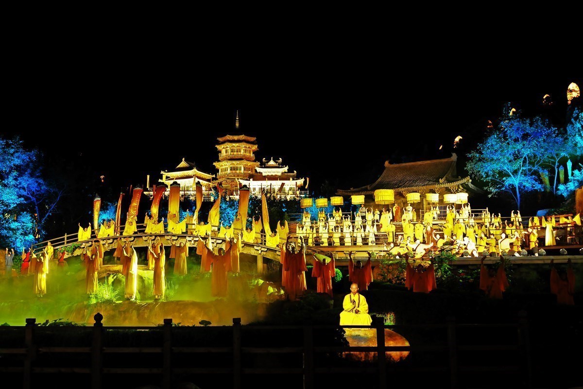 《禪宗少林·音樂大典》實景演出由譚盾提綱藝術(shù)總監(jiān)和音樂原創(chuàng),梅帥元制作,易中天、釋永信顧問,黃豆豆編導,陣容強大,實力空前。演出分為《水樂》《木樂》《風樂》《光樂》《石樂》五個樂章,演出規(guī)模宏大,音畫一體,88架古箏的激情演奏,近600人的禪武演繹,春夏秋冬的景觀變化,直指心性的佛樂禪音,奏響了一曲中岳嵩山的輝煌交響,成為中原文化旅游的一大亮點。