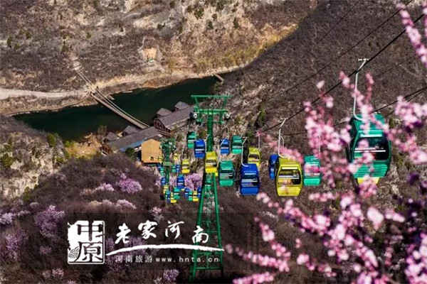索道下的桃花成片初開(kāi),從空中看花非常精彩!