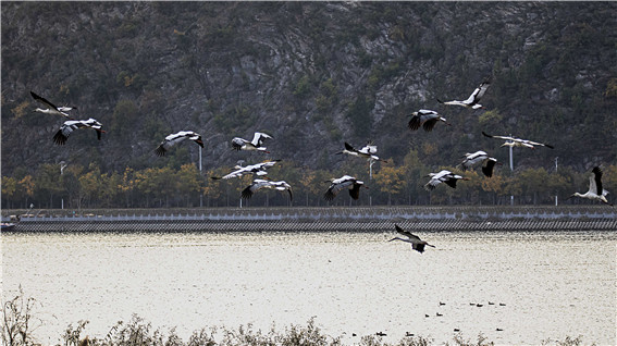 11月25日,28只國(guó)家一級(jí)重點(diǎn)保護(hù)野生動(dòng)物東方白鸛現(xiàn)身河南丹江濕地國(guó)家級(jí)自然保護(hù)區(qū)。 鄧天鵬 攝