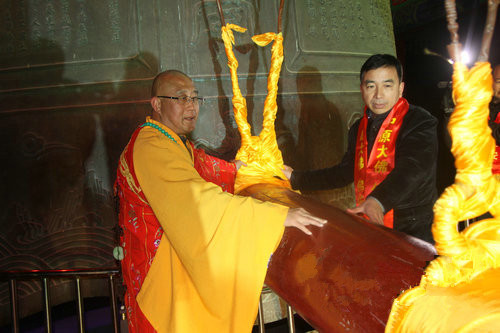 晚10時左右,中原大佛“鐘鳴天下,福滿人間”元旦迎新撞鐘祈;顒诱介_始。在歌舞聲中,游客和信眾在大德高僧的帶領(lǐng)下舉行了莊嚴(yán)的迎新祈福法會,當(dāng)晚23:59,倒計(jì)時的喊聲響徹夜空,在新年的那一刻起,116噸重的世界鐘王,雄渾的鐘聲穿越夜空,久久回蕩天際。