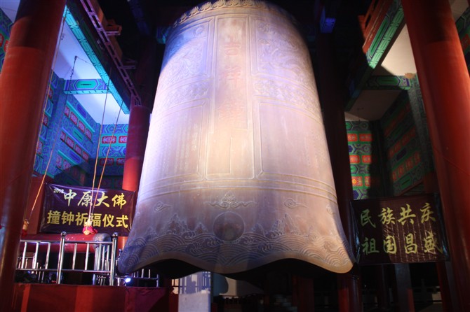 “年年鐘聲迎新歲,歲歲鐘聲有不同“。據(jù)介紹,中原大佛景區(qū)的吉祥鐘由天瑞集團(tuán)公司出資,天瑞鑄造公司于2000年6月份開始鑄造,同年的12月28日完工,于2001年元旦零時零分在這里首鳴21響,標(biāo)志著21世紀(jì)的來臨,因此該大鐘又稱“世紀(jì)鐘”。吉祥鐘重為116噸,高8.108米,最大直徑為5.118米,厚度達(dá)20多公分,是世界上最大、最重的外擊式青銅鐘,于2002年經(jīng)專家鑒定,獲得世界吉尼斯記錄認(rèn)證證書。