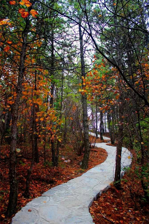 林間小道曲徑通幽,紛紛落下的紅葉和翠綠的松柏構(gòu)成了一幅色彩斑斕的畫卷。