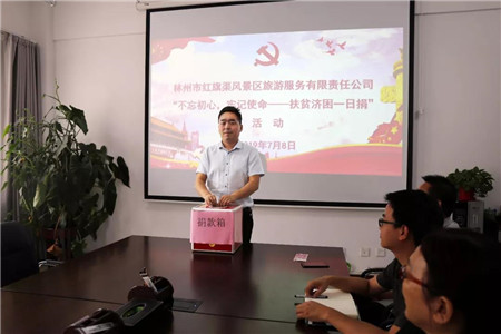 為積極響應林州市委、市政府的號召,大力弘揚中華民族扶貧濟困的傳統(tǒng)美德,7月8日,紅旗渠風景區(qū)組織開展了“不忘初心,牢記使命——扶貧濟困一日捐”獻愛心活動,公司職工紛紛慷慨解囊、獻出愛心,以行動彰顯社會責任,用大愛書寫為民情懷。