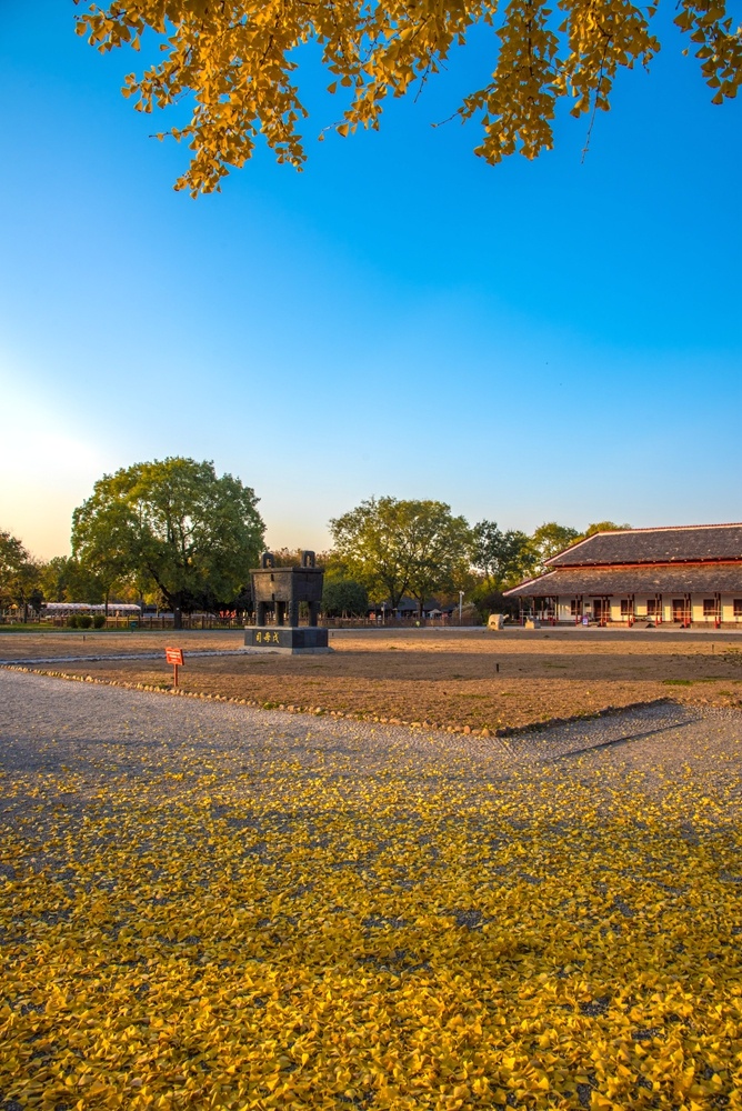 冬日的殷墟,當(dāng)銀杏樹葉子變黃,再遇上落日余暉,那一抹金色會(huì)給人們帶來視覺上的震撼。