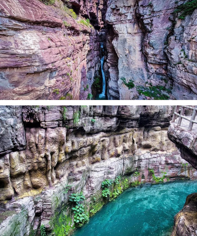2公里蜿蜒的峽谷,深藏于68米的地下,紫紅色的石英巖層層疊疊,紅巖似火,和翡翠般的潭水相得益彰,形成了秀氣嫵媚的峽谷奇觀。