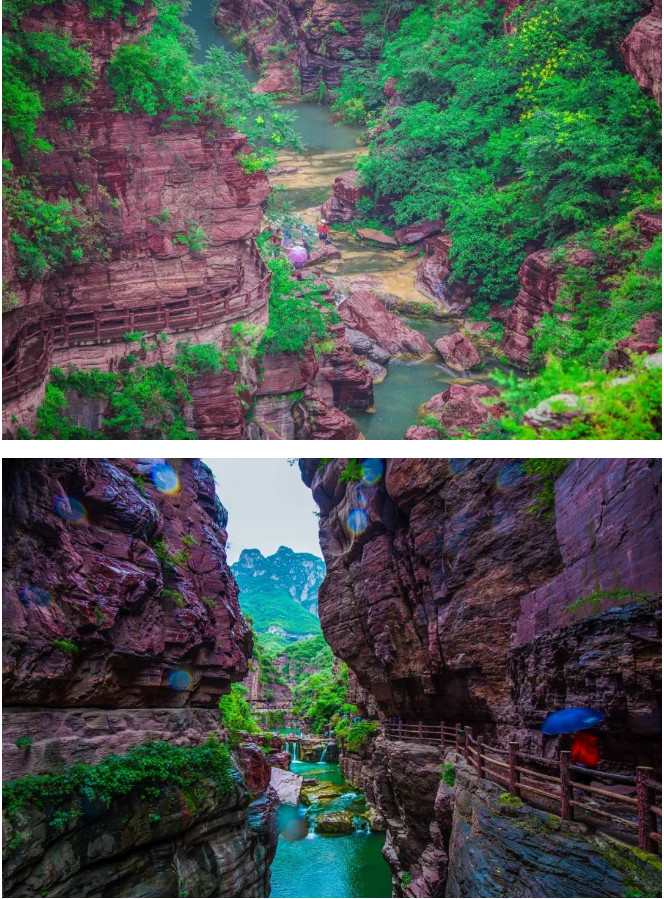 雨天,流雨如飛花,山石如紅綢。經(jīng)過雨絲潤(rùn)色的紅石峽,宛若青花瓷里的釉里紅,格外艷麗,又似色彩鮮明的油畫,朦朧且詩(shī)意。