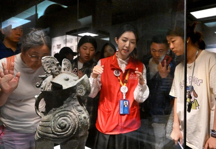 2024年4月26日,河南博物院志愿者覃妍潔(居中紅衣者)為游客講解婦好鸮尊。 李安 攝