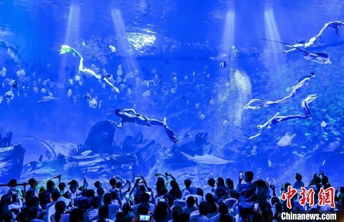 圖為游客在鄭州海昌海洋旅游度假區(qū)觀看“美人魚(yú)”表演。黃勇軍 攝