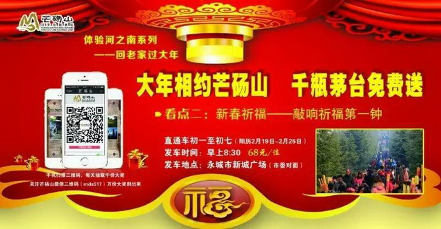 芒碭山春節(jié)傳統(tǒng)文化源遠(yuǎn)流長(zhǎng),第六屆“鄉(xiāng)音未改.大年相約芒碭山”民俗演出活動(dòng)更是豐富多彩。特別是“大年相約芒碭山 千瓶茅臺(tái)免費(fèi)送”系列抽獎(jiǎng)活動(dòng)將千瓶茅臺(tái)原漿酒、特產(chǎn)美食、門票抵用券、掛歷等萬(wàn)份大獎(jiǎng)送給廣大游客,讓您感受濃郁家鄉(xiāng)年味,同時(shí)驚喜無(wú)處不在,廣大游客只需關(guān)注芒碭山旅游官方微信“mds517”即可參與抽獎(jiǎng),這些禮品都將屬于您,還在等什么拿起您的手機(jī)趕快行動(dòng)吧!