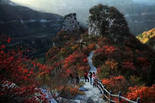 走過了春天的山花爛漫、夏日的激情澎湃,青天河的碧水青山,迎來了一年中最美的季節(jié)!靳家?guī)X上萬(wàn)山紅遍,叢林盡染,赤橙黃綠青藍(lán)紫,色彩眩目到耀眼。數(shù)十萬(wàn)畝的紅葉林是太行山留給河南一張最煊赫的名片。漫山遍野的黃櫨、五角楓,已經(jīng)等不及落霜,就紅透了山崖。放眼望去滿山皆是紅妝,像是誰(shuí)家兒女嫁娶的現(xiàn)場(chǎng)。