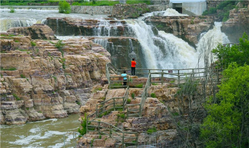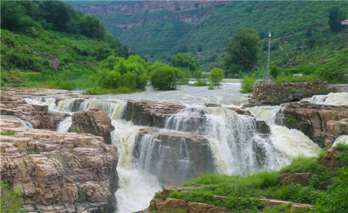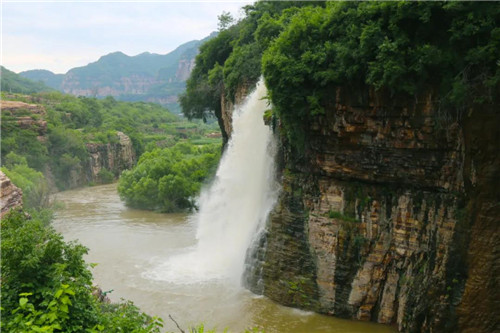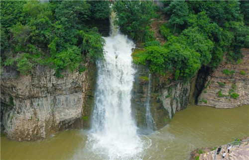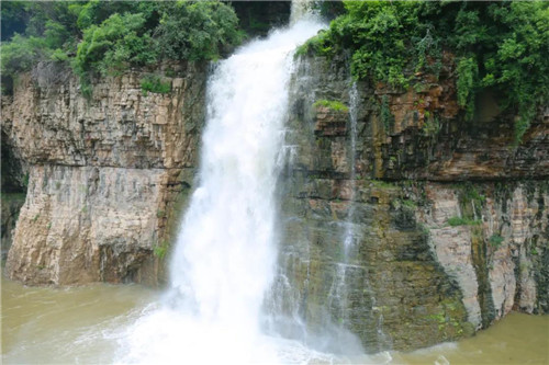 河水從斷崖上飛瀉成瀑,跌落百米深的絡(luò)絲潭。漳河水奔騰咆哮、氣勢雄渾,響徹整個山谷。