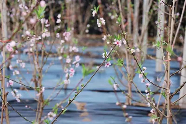 棚內(nèi)粉紅色的桃花嬌艷動人,翠綠的葉芽競相綻放。讓人流連忘返,渾然不知身處哪個季節(jié)。