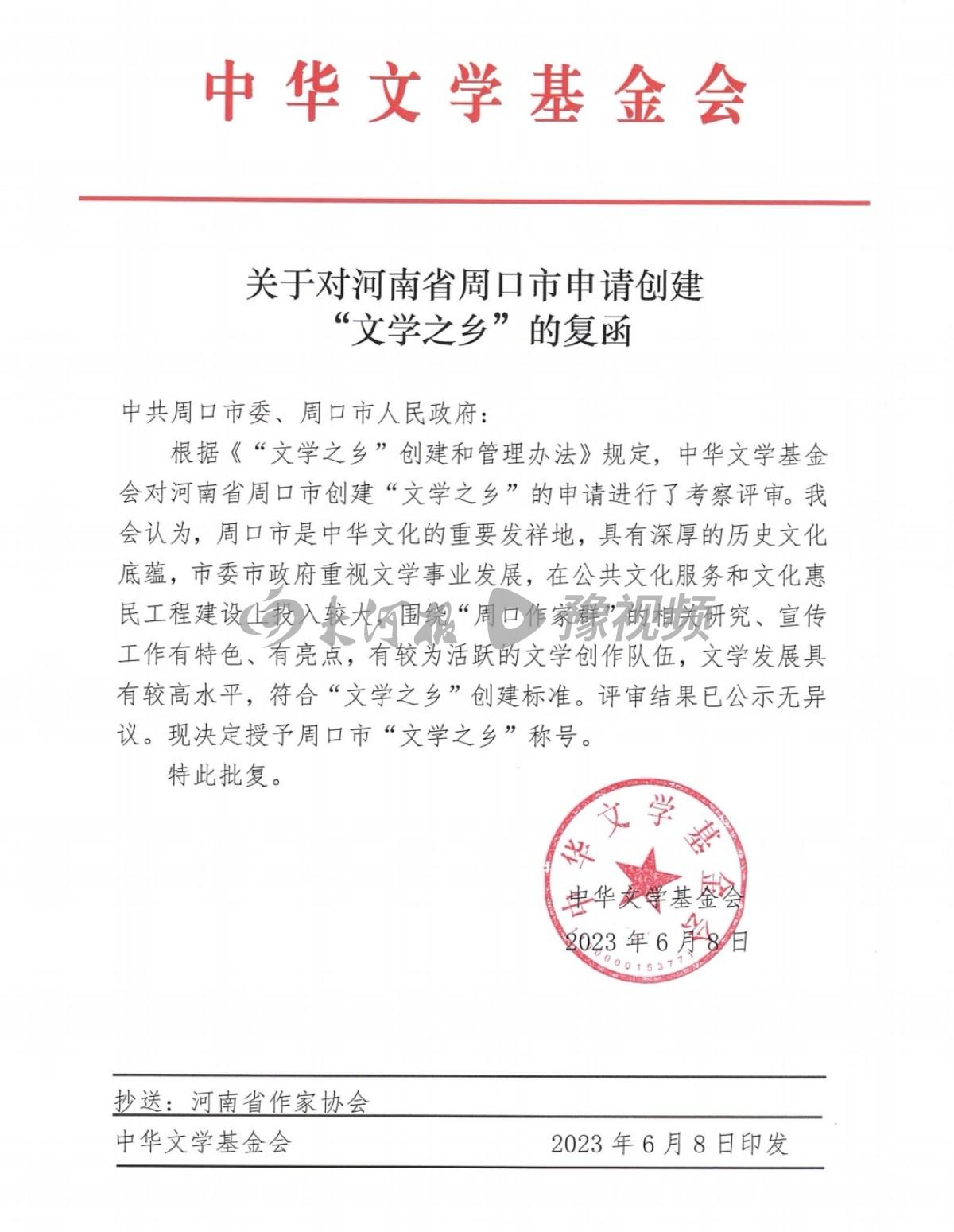 6月8日下午,記者從周口市作家協(xié)會(huì)獲悉,中華文學(xué)基金會(huì)正式復(fù)函,決定授予河南省周口市“文學(xué)之鄉(xiāng)”稱(chēng)號(hào)。