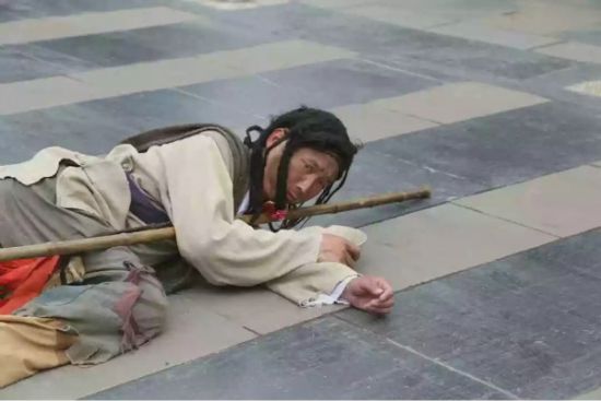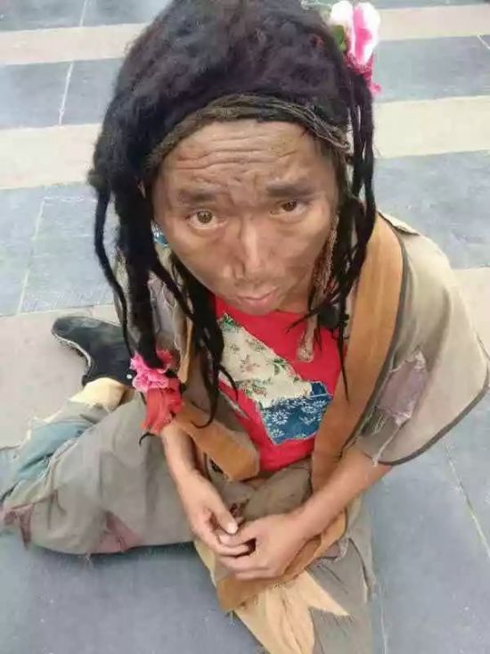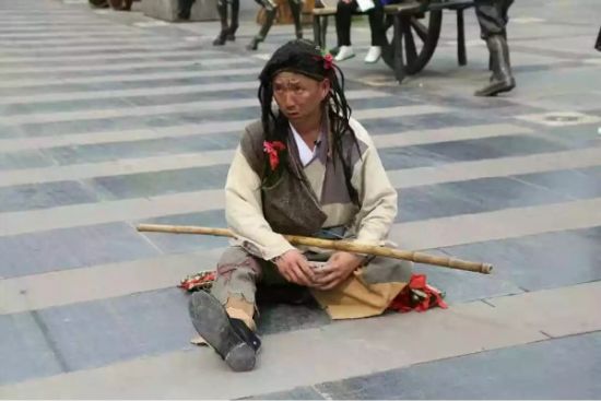 小乞丐為了博得游客一笑,在地上“撒潑耍賴”,