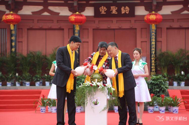 三個白瓷瓶中分別盛有成都的母親河——府河的水,以及在河洛交匯地——鞏義采集的黃河水、洛河水。成都市文聯(lián)主席梁平,鞏義市政府副市長劉軍杰、鞏義市政協(xié)副主席吳建祿,三位領(lǐng)導(dǎo)將府河水、黃河水、洛河水共同注入唐三彩罐。