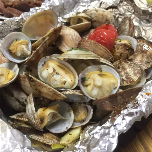 ②燒烤時(shí)把錫紙折成碗狀,花蛤和切好的配料都放進(jìn)去,等熟就行,怕味道淡的可以再放點(diǎn)鹽。