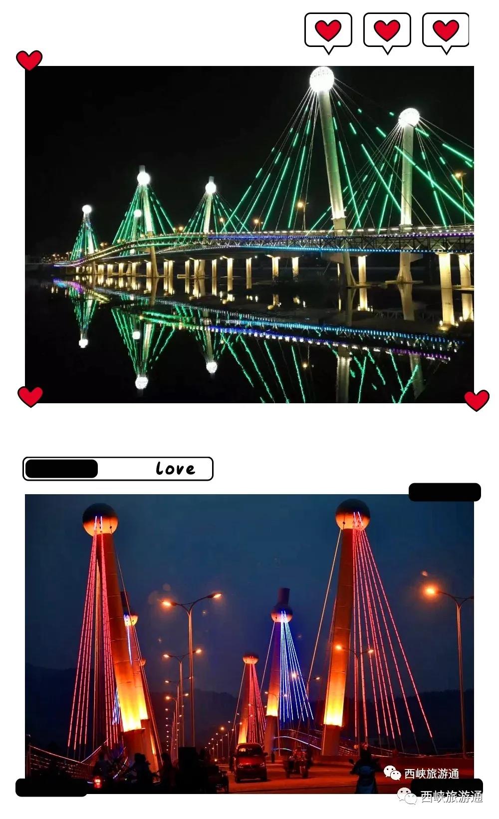 眼前是粼粼鸛河水,夜半憑欄,七八個(gè)剪影攜三兩條霓虹,繪出在對(duì)岸看著風(fēng)景的你,彩虹橋上一排排斜立拉索,似一把豎琴的琴弦,奏出西峽山城的風(fēng)情樂章!