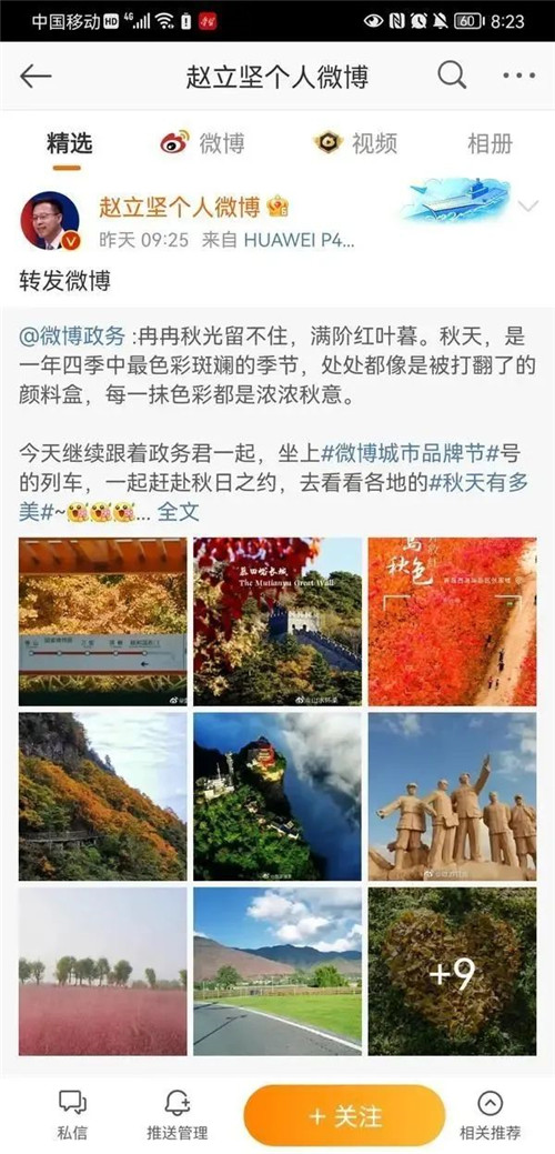 10月25日,外交部發(fā)言人趙立堅在個人微博轉(zhuǎn)發(fā)了一條展示我國各大城市秋日美景的微博。其中濟源王屋山景區(qū)、五龍口景區(qū)、濟水源牡丹花園作為河南優(yōu)質(zhì)代表被重點推薦。網(wǎng)友們直呼:“太美了!”“看到了我的家鄉(xiāng)河南濟源,王屋山的紅葉太壯觀了!”