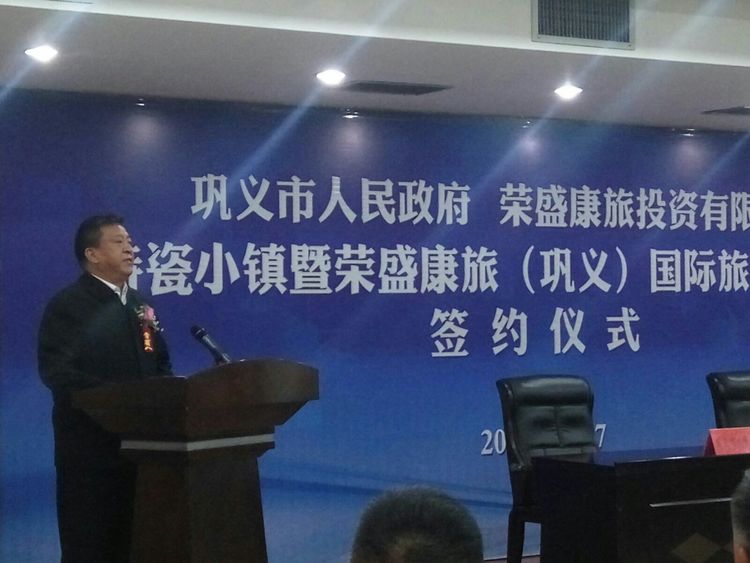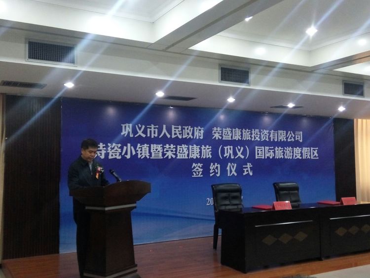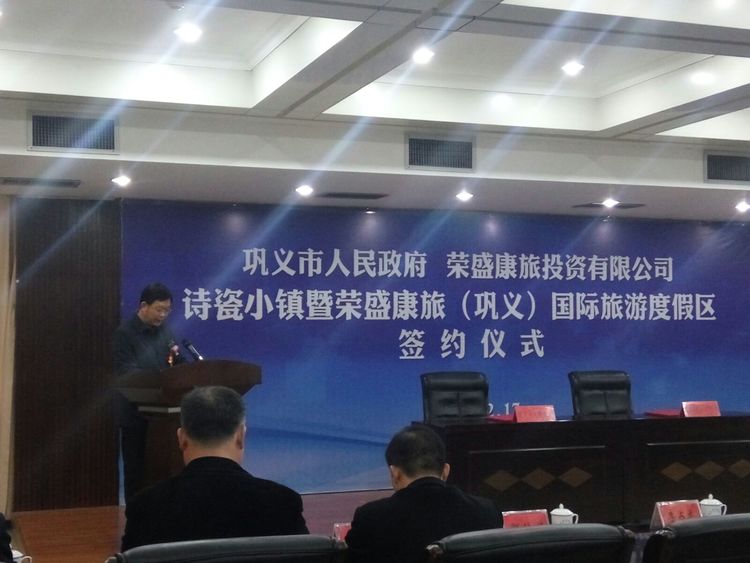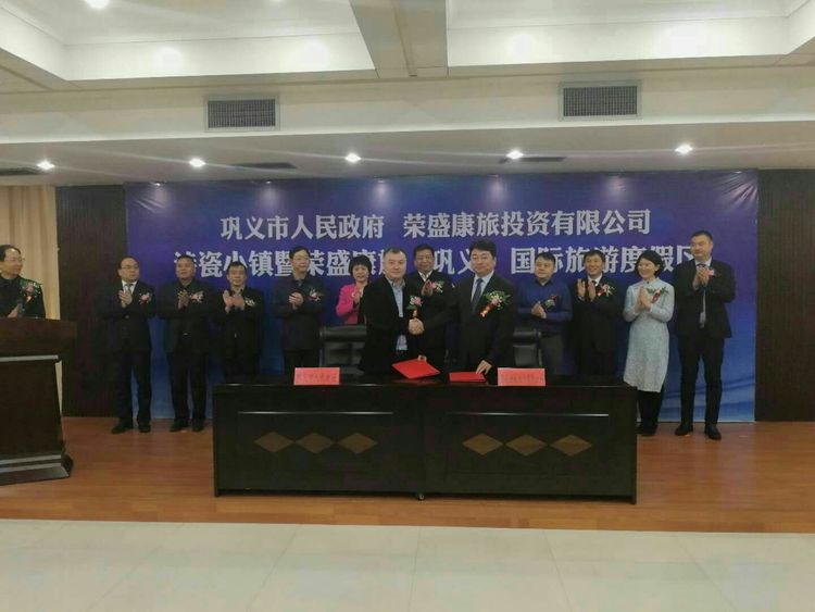 鞏義市政府副市長劉軍杰和榮盛發(fā)展副總裁、榮盛康旅副總裁張志勇進行簽約
