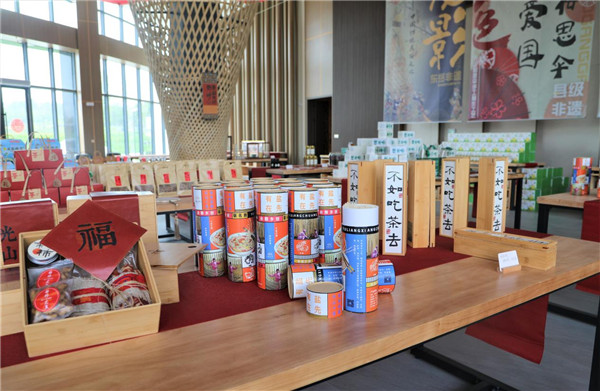 在光山縣東岳村花鼓戲傳承中心展廳,各種鄉(xiāng)創(chuàng)產品琳瑯滿目。 向宣垣 攝