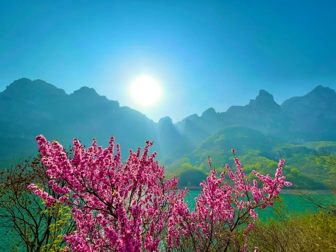 春山蒼蒼,春水漾漾,云臺山一派明媚的春光,岸柳青青,春意縈繞,桃花灼灼,千花百卉爭明媚。