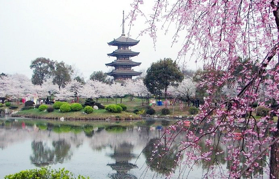 純?nèi)帐降膱@林設(shè)計(jì)精巧而不失大氣,讓人仿佛置身于櫻花的國度。園中標(biāo)志性建筑五重塔,是中國武漢市與日本弘前市友好往來的象征。園中最珍貴的是“七十八棵櫻花樹”,那是日本前首相田中角榮為緬懷周恩來總理(時(shí)年周總理誕辰七十八周年),頒揚(yáng)周總理維護(hù)世界和平、致力于中日友好所作出的巨大貢獻(xiàn)而贈送給鄧穎超同志的,為了紀(jì)念中日友誼,鄧穎超同志特意安排將這78棵櫻花樹定植在周恩來總理生前生活和工作過的武漢東湖。