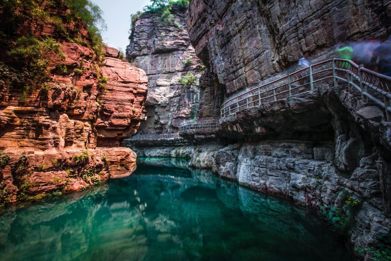 云霧緩緩纏繞在暗紅色的崖壁,在絲絲細(xì)雨的洗禮下顯得格外鮮艷奪目,湖水清澈,波光粼粼,經(jīng)過(guò)雨滴的點(diǎn)綴更像是一塊明玉。