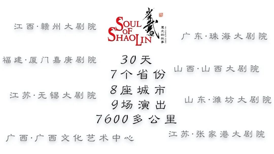 此次巡演先后歷時30天,行經7個省份8座城市,成功舉辦9場演出,總行程7600多公里,涵蓋了粵港澳大灣區(qū)、長江三角洲地區(qū)、中部地區(qū)。劇組成員不顧奔波勞累,以飽滿的狀態(tài)、高質量的演出為當地觀眾展示中國功夫的獨特魅力,進一步擦亮老家河南、中國功夫“金名片”。