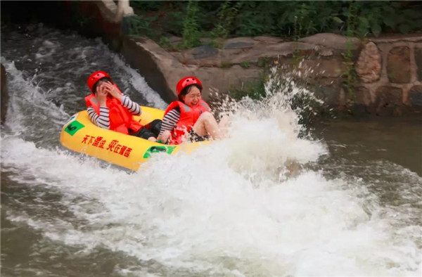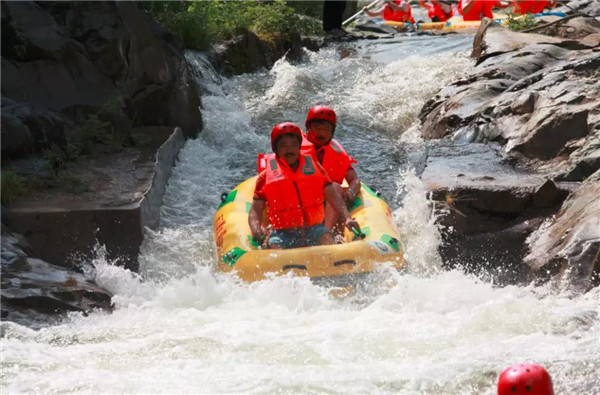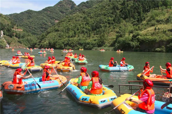 迎著午后的清風(fēng),百對(duì)雙胞胎全副武裝,拎槳登船,由劉秀湖開(kāi)戰(zhàn),湖面浪花飛濺,穿暗河、越巖洞,急流之處展絕技,岸上加油助威的游客,似乎比選手更緊張,聲聲吶喊響徹峽谷。